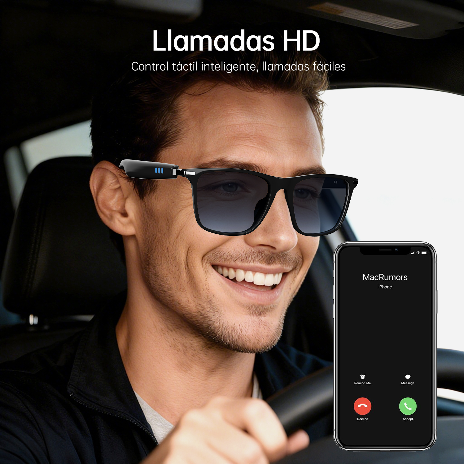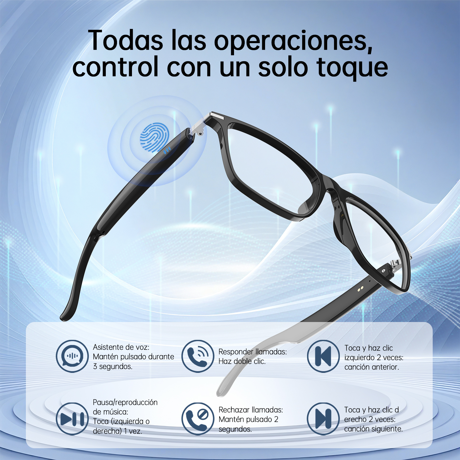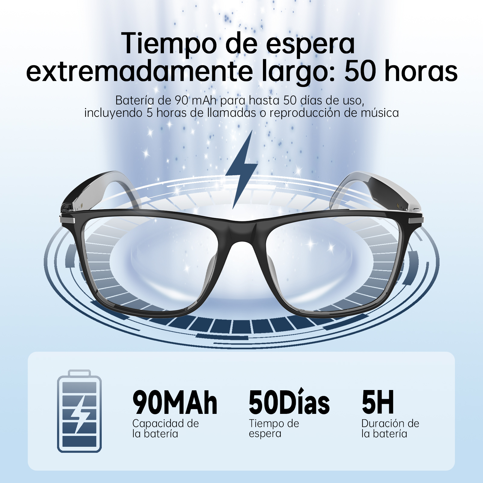 La batería de 90 mAh ofrece hasta 50 días de duración, con 5 horas de conversación o reproducción de música. Estas gafas inteligentes son compatibles con control táctil inteligente y asistentes de voz, lo que permite alternar entre manos libres y control táctil sin problemas.