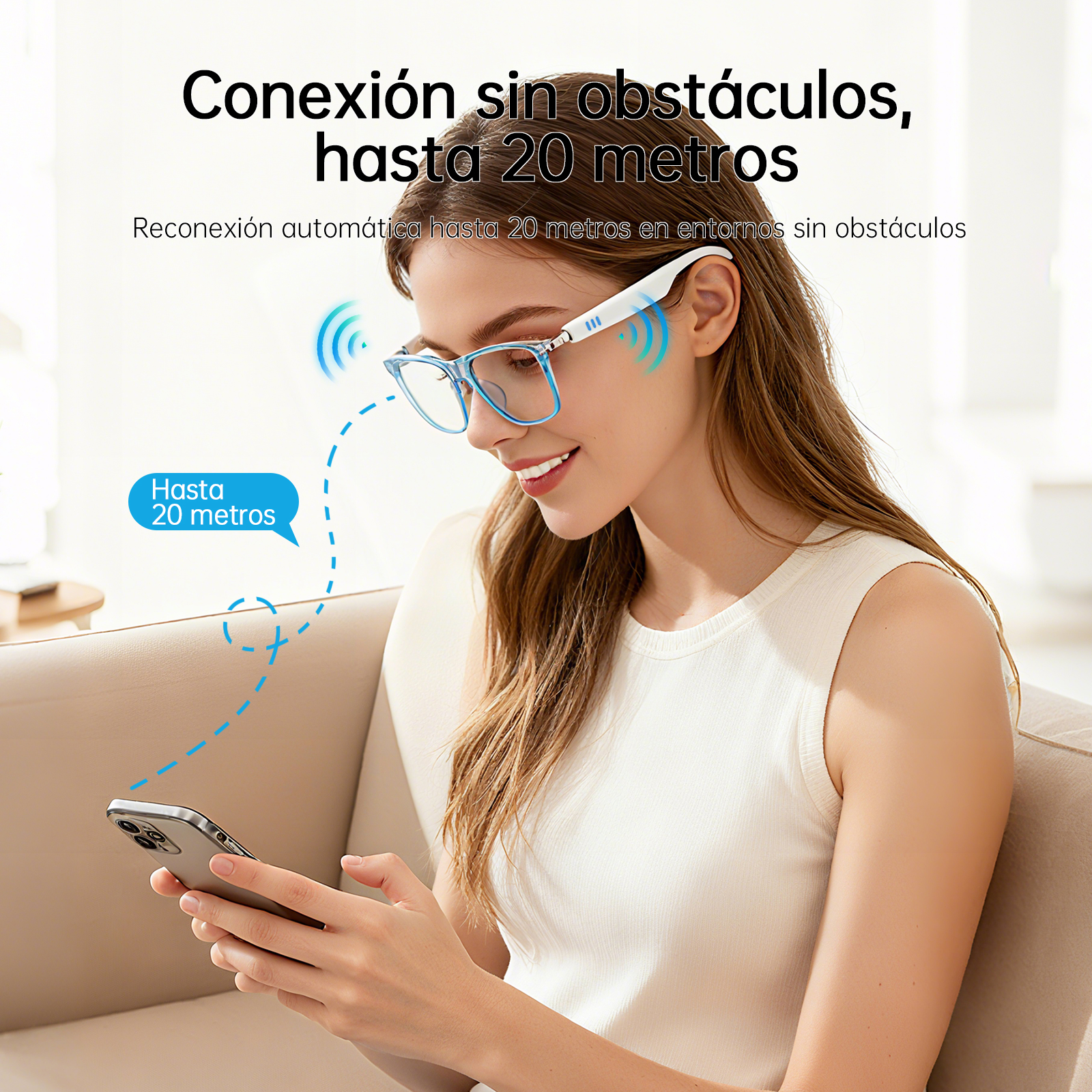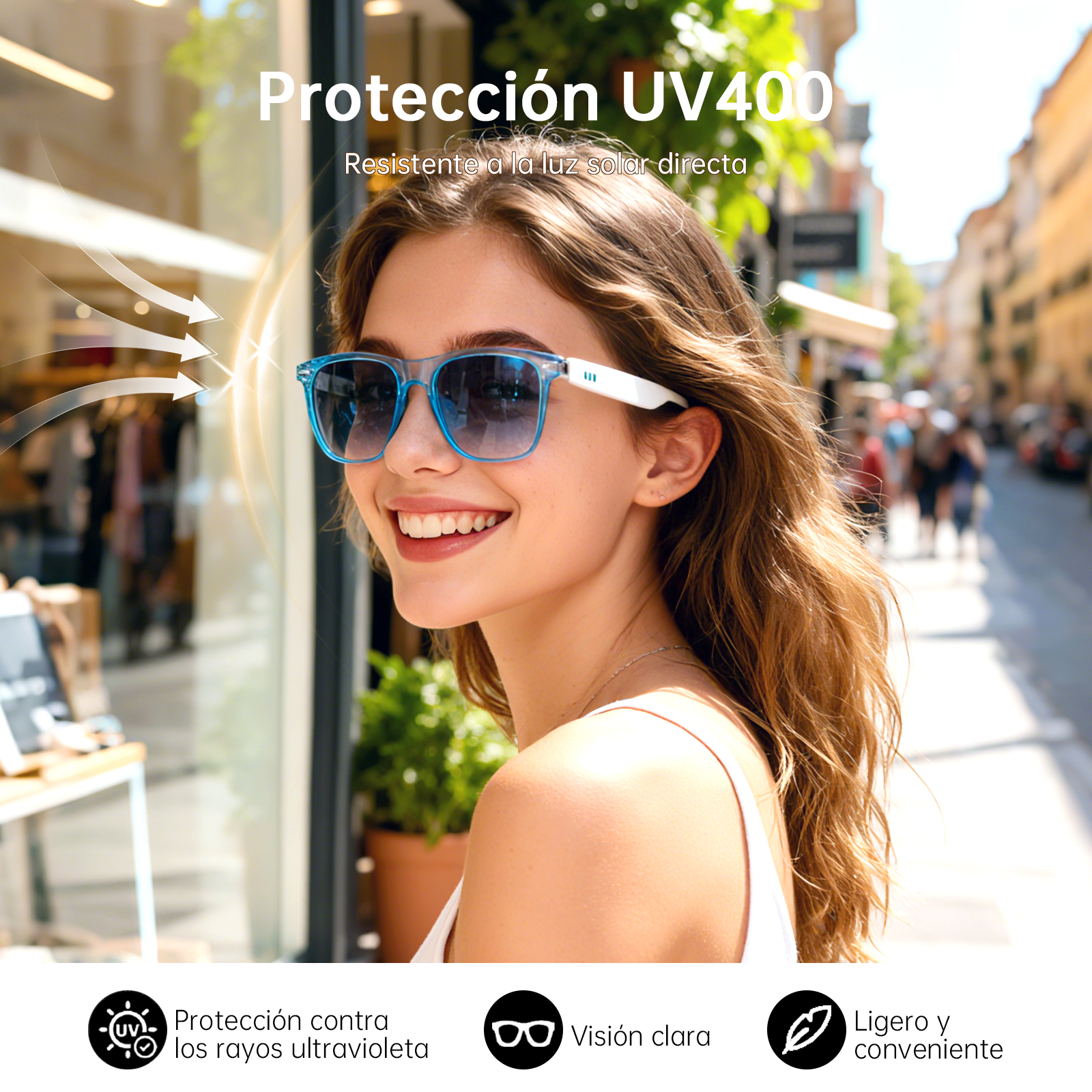 Las gafas inteligentes Bluetooth G-TiDE BV0 cuentan con protección UV400 integrada, lo que las hace resistentes a la luz solar directa. La versión inalámbrica 5.3 garantiza una conexión rápida y estable, compatible con A2DP/AVRCP/HFP/HSP, y se reconecta automáticamente en un radio de 20 metros sin obstáculos.